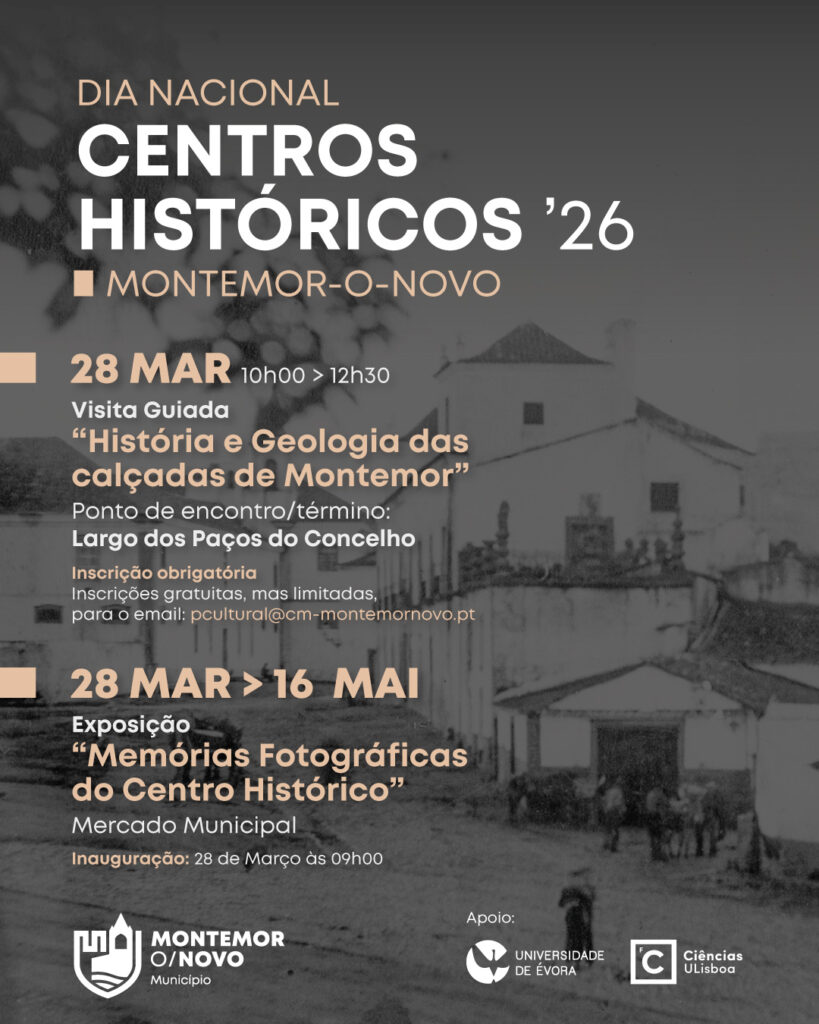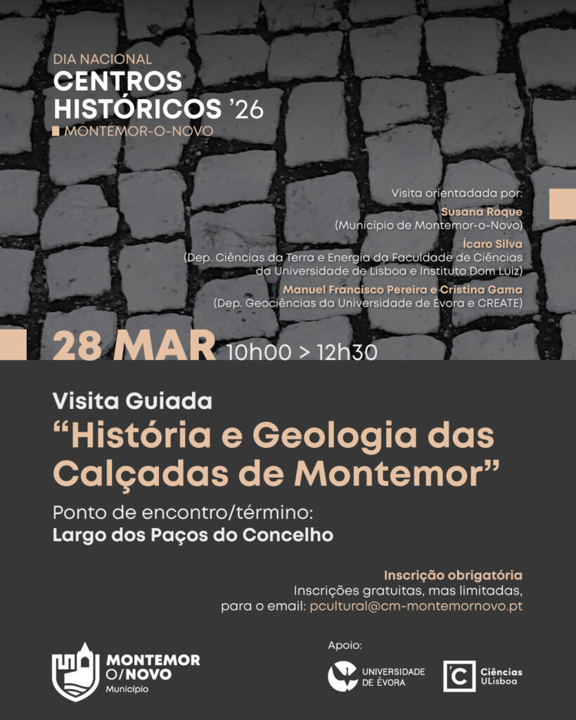 O Município irá organizar na manhã de 28 de março, das 10h00 às 12h30, uma Visita Guiada à “História e Geologia das calçadas de Montemor”. Ao longo desta visita, iremos percorrer algumas ruas do centro histórico, explorando os nomes antigos das ruas, muitos dos quais resistiram à passagem do tempo, mas propomos também um olhar diferente sobre o próprio chão que pisamos. Esta visita será orientada por Susana Roque (Técnica Superior do Município), Ícaro Silva (Dep. de Ciências da Terra e Energia da Faculdade de Ciências da UL e Instituto Dom Luiz) e por Manuel Francisco Pereira e a Cristina Gama (“Dep. Geociências da Universidade de Évora e CREATE”).