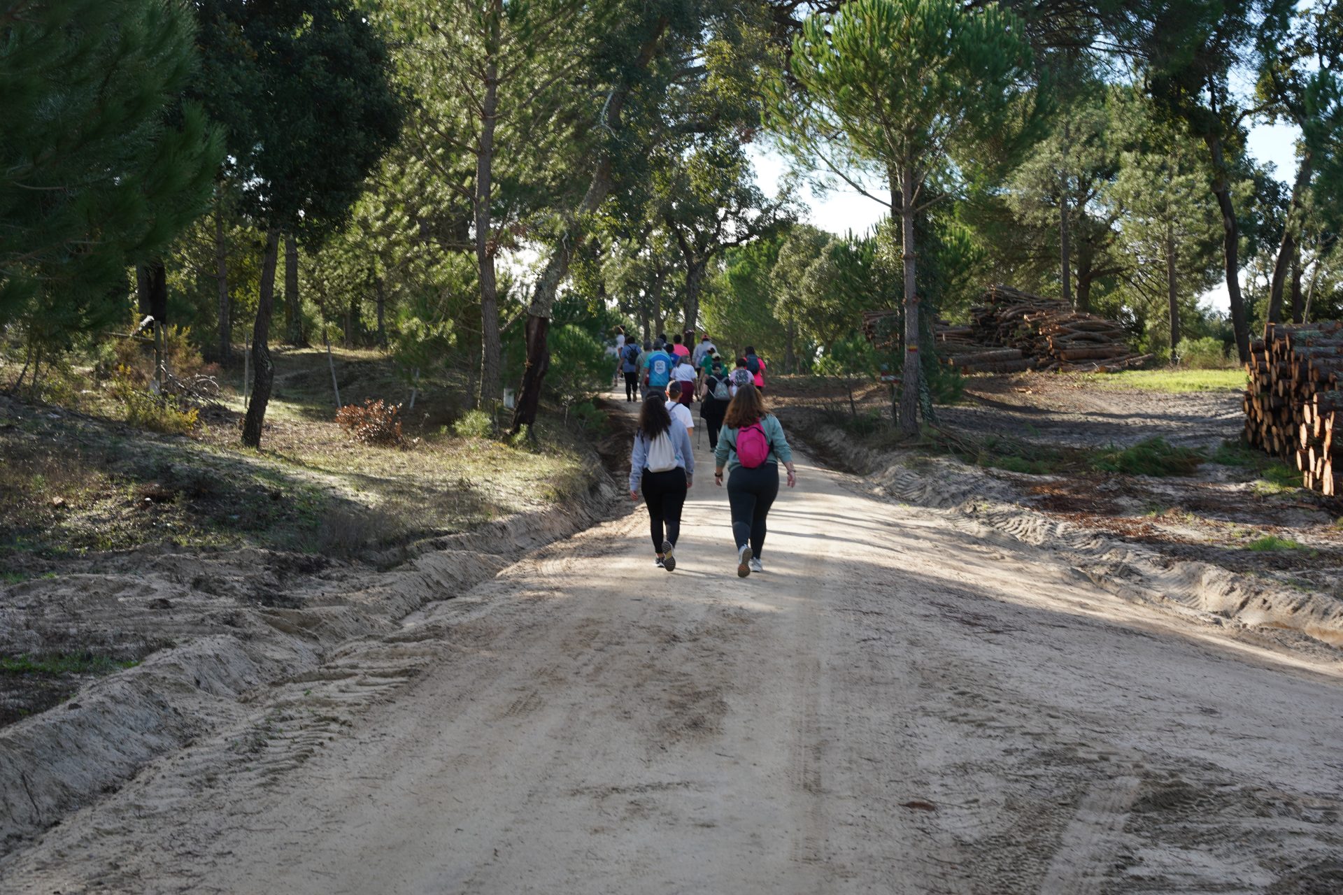 A saída do Largo José Saramago para o território florestal é quase imediata pela Rua do Pinheiro. À esquerda avista a igreja dedicada a N. Sra. da Ajuda. Siga em frente por caminho florestal. Após pequena descida, suba ligeiramente e chegue ao cruzamento para encontrar o local de Casas Novas e tome a direita, por asfalto. Depois, vire pela direita por caminho florestal até Vale da Chama. Vire à direita para Vale da Pedreira, onde se atravessa a ribeira em ponte rural, o ponto de menor altitude do percurso. O trajeto segue entre Vale do Carvoeiro e Vale das Custas, zona de menor densidade florestal na subida até Alhos Vedros. Após passagem das últimas quintas, entre na povoação e vire à direita na Rua Direita, de novo à direita na Rua 1.º de Maio e, finalmente, à esquerda na Rua da Liberdade até atingir o ponto de partida.
