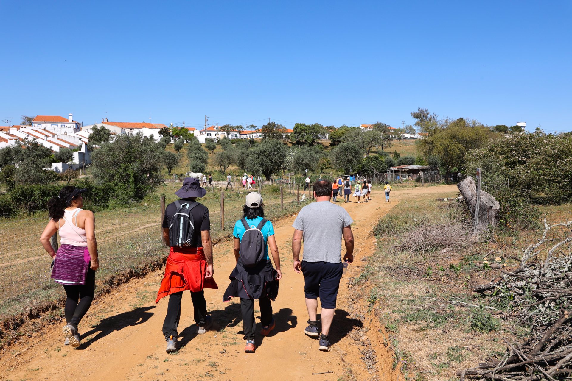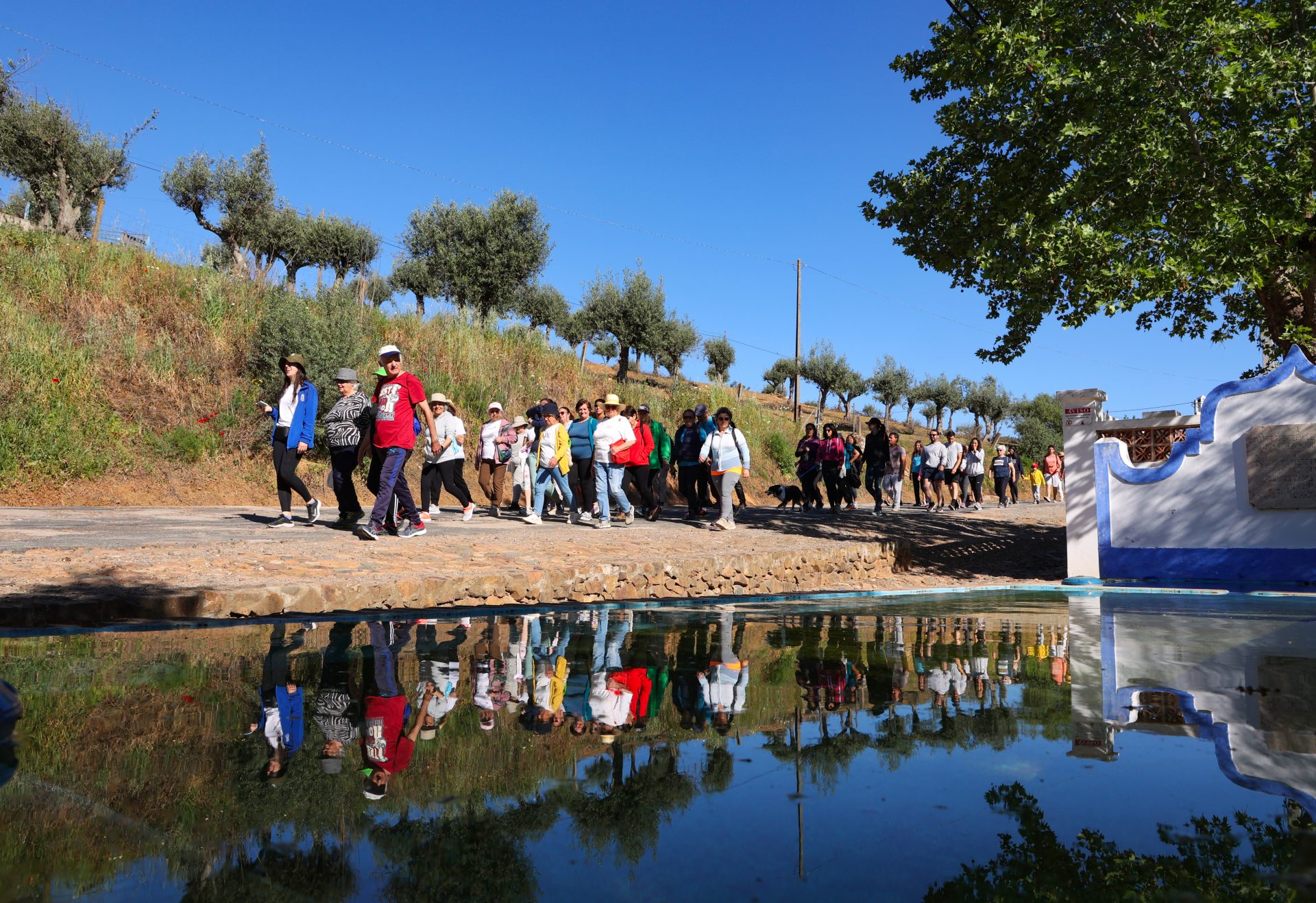 uma zona de lotes de vivendas e olivais. Passe estes lotes, aceda à estrada de acesso à aldeia, tome a direita e siga entre olivais tradicionais. Passe a ponte rodoviária sobre a ribeira e aviste o lavadouro, o bebedouro e o fontanário. Continue adiante até atingir o espaço urbano da aldeia, virando à direita pela Tv. da Indústria e depois na terceira à esquerda, pela Rua 1.º de Dezembro, até ao Jardim Público.